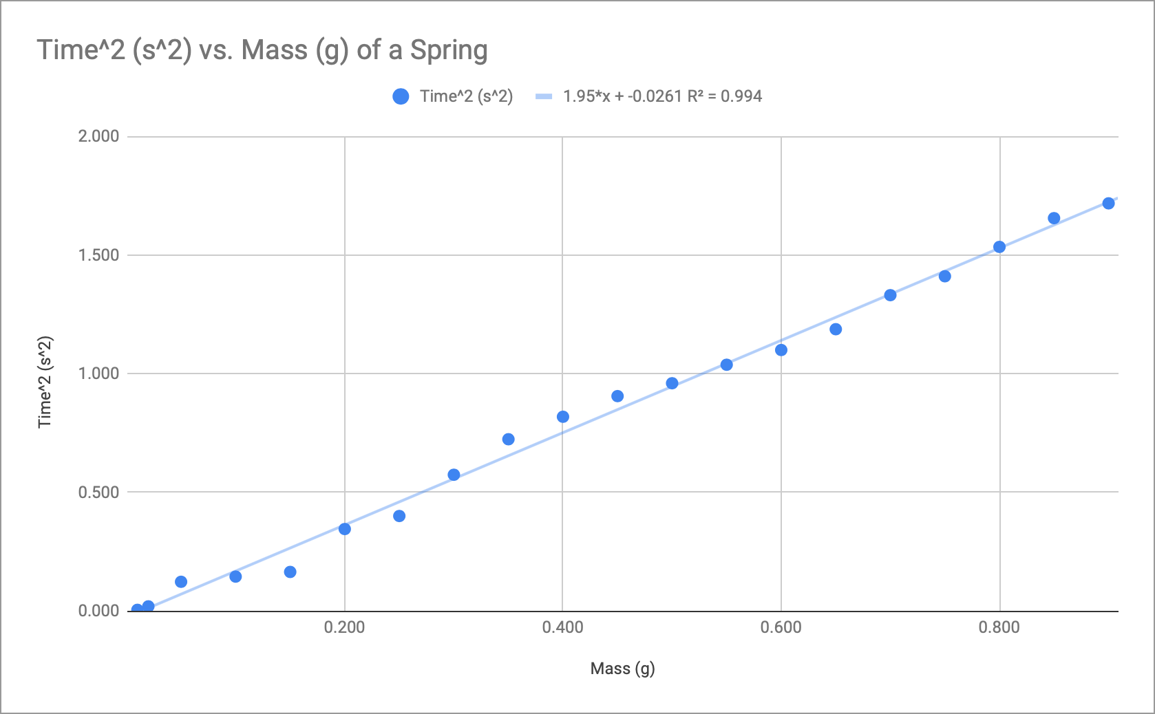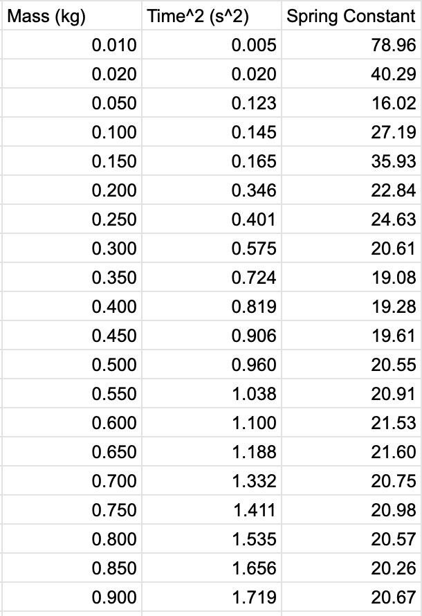 The spring constant for the one we tested was approximately 20 N/m, which fits into the range provided by Mr. Murray that students had gotten in years past, which was between 10 - 30 N/m. Some weaknesses or errors could have arisen during the collection of the data. Since I was the only one there, no one was able to check or even to make the process easier, because I had to release the weight holder and start the timer at the same time. While having someone there may have overall helped the validity of the data, I’m not sure how you can quantify it considering the value of the coefficient of determination was almost exactly one, and how close the projected value of k and the actual value of k were. To summarize, I am impressed with what I have learned in this lab. Could there be slight improvements in the lab? Of course, no lab is always perfect or exact. But I look forward to seeing how helpful springs are in the future, just as they were in the past. Top