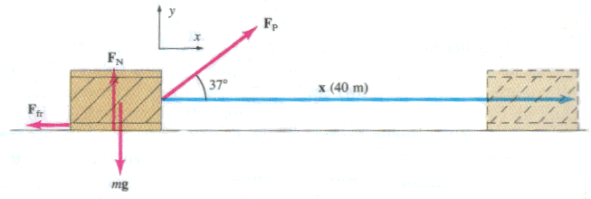 A 50-kg crate is pulled 40m along a horizontal floor by a constant force exerted by a person, Fp = 100N, which acts at a 37o angle. The floor is rough and exerts a friction force Ffr =50N. Determine the net work done on the crate.